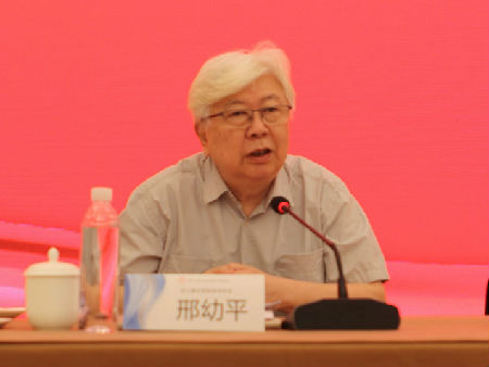 图为第三届理事会会长邢幼平在大会上作工作报告